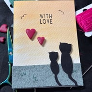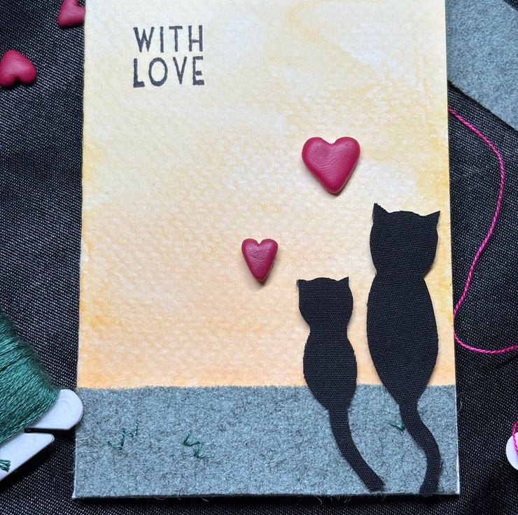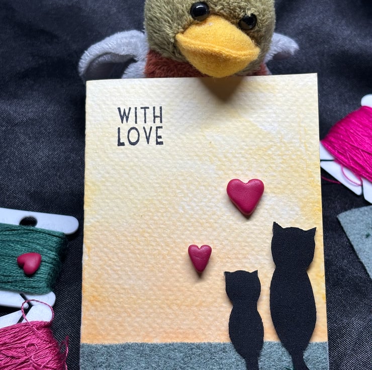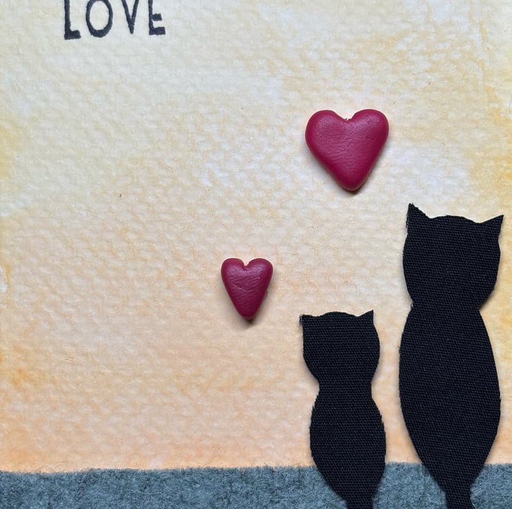 A sweet little card featuring two black cats in 100% black cotton, sitting on the wool felt grass and gazing off together into a beautiful water colour morning. Solid pink handmade fimo hearts leave the receiver in no doubt that this card is sent with love. Presented on watercolour paper to create an A7 size piece, complete with B&bE tag on the reverse.