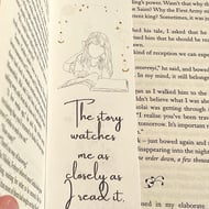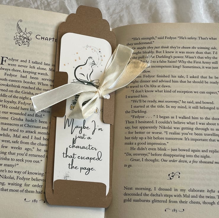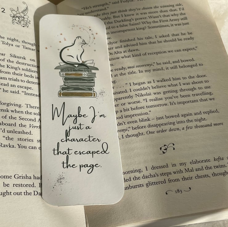Handmade double layered heavy cardstock bookmark, unique quote written by me, inspired by the reader’s feeling, and by my own readings. Handcut, glued together, and hand painted details in acrylic gold, to add that touch of magic that books bring to reality.