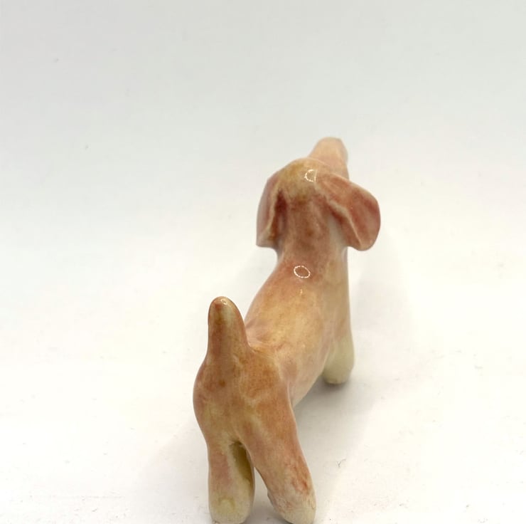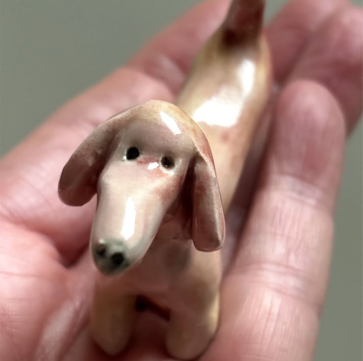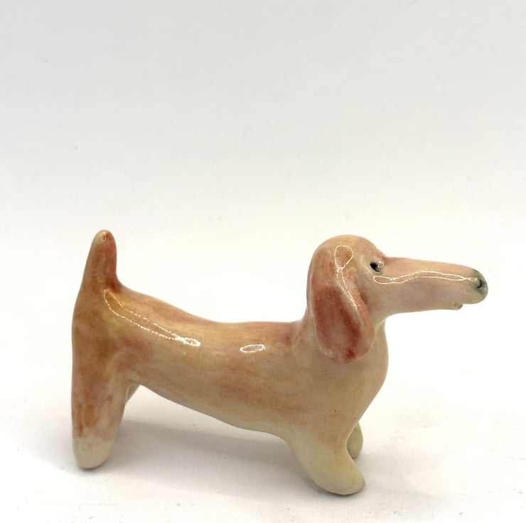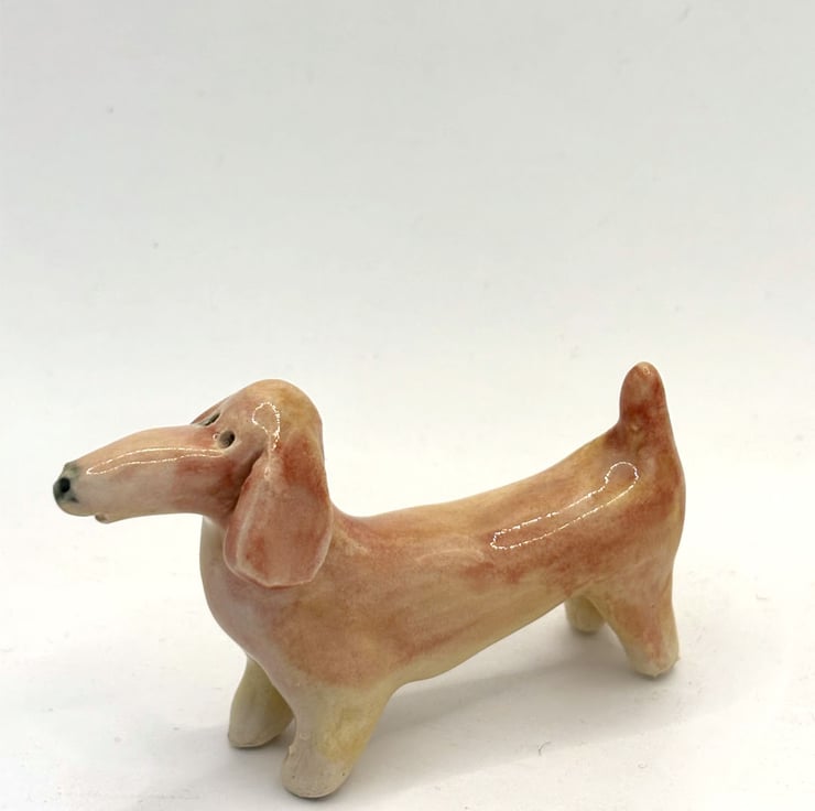 A handmade and hand decorated ceramic sausage dog figurine. I make many breeds of dogs but am really drawn to the shape and character of a sausage dog. I like to make each one different, with its own personality- just like a real dog.