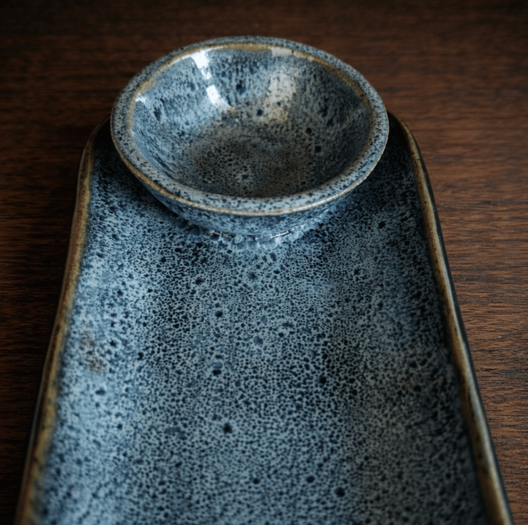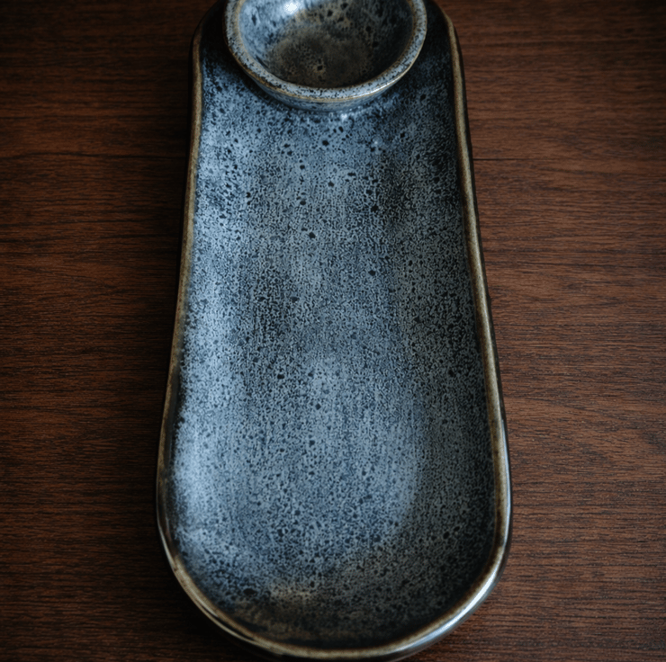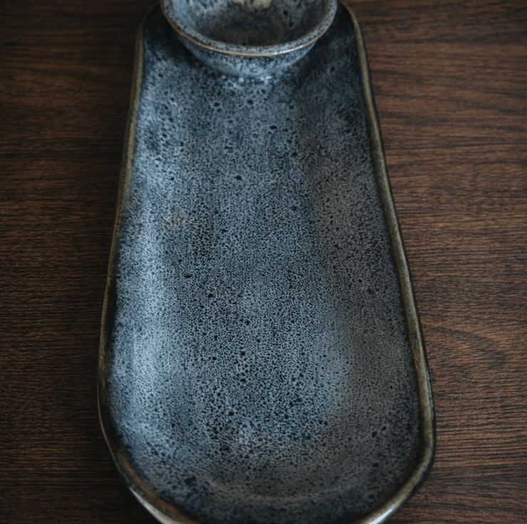 A unique chip and dip tray. Glazed with Storm and layers of Snow x