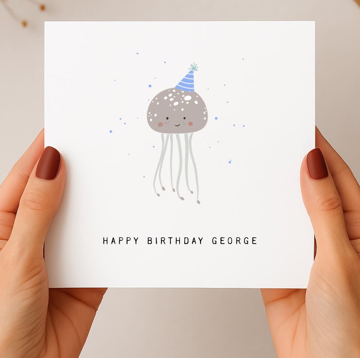 A fun birthday card featuring an adorable hand drawn jellyfish wearing a party hat. Personalised with any name to make their special day extra unique!