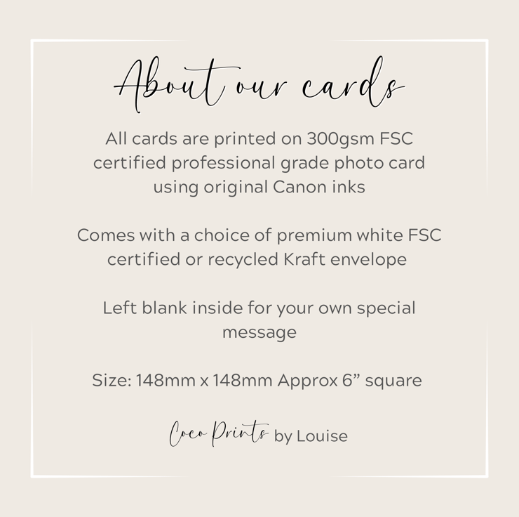 This unique card is made from a hand drawn illustration and printed on to 300gsm matte coated photo card and accompanied by a premium white or Kraft envelope.