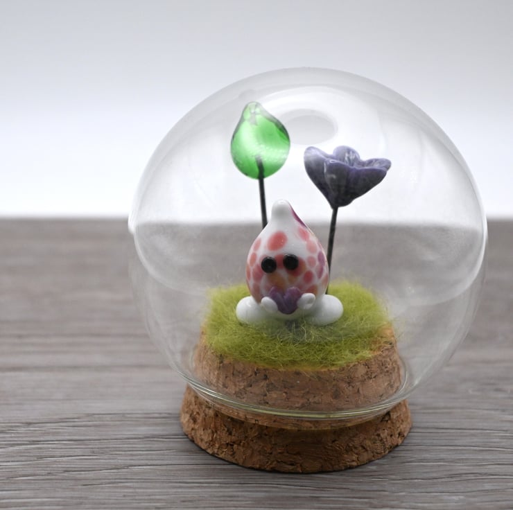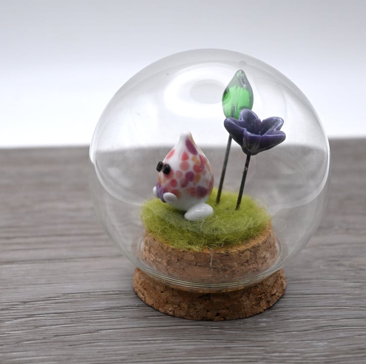 It features green fibre and a handmade lampwork glass wisp, a purple lampwork glass flower and a green lampwork glass leaf.
