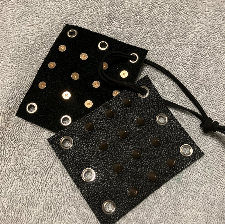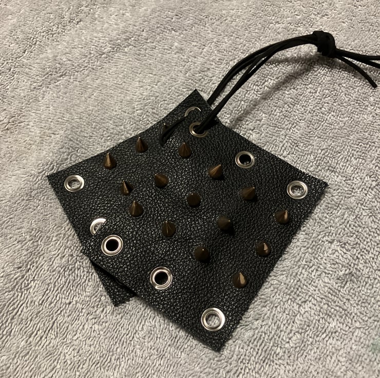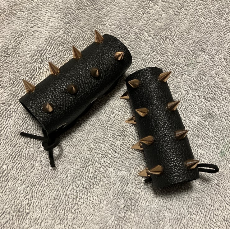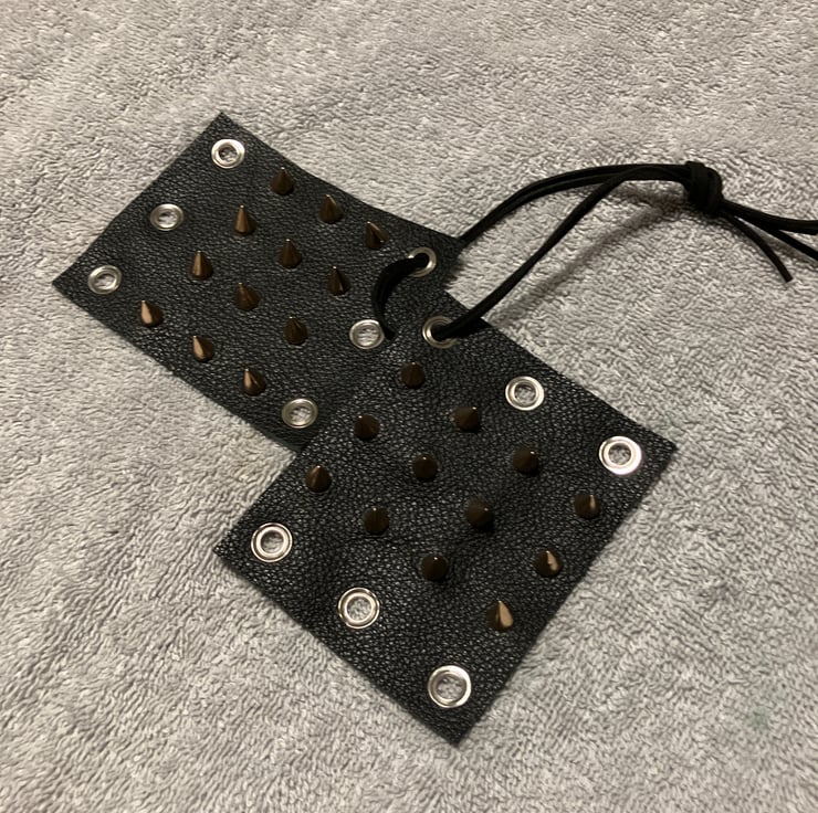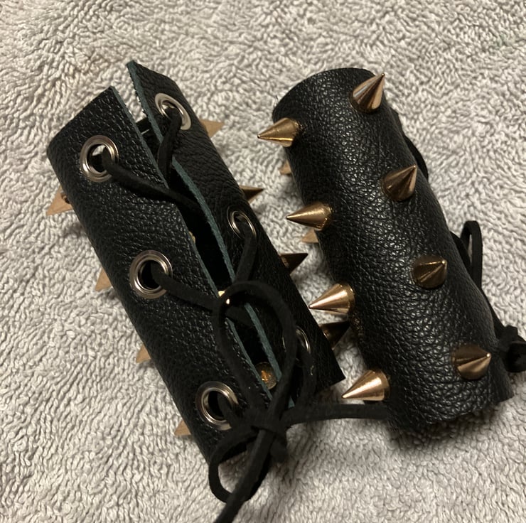 The specs on these WHDs are quite simple. They measure 9cm X 10cm. The black leather is a soft 2.0 oz leatherweight, with 12 brass coloured 7mm spikes/cones strategically placed on each WHD (that's 24 in total). A leather lacing is given for each WHD. (sold as a pair)