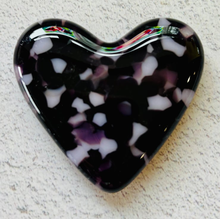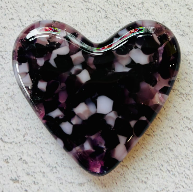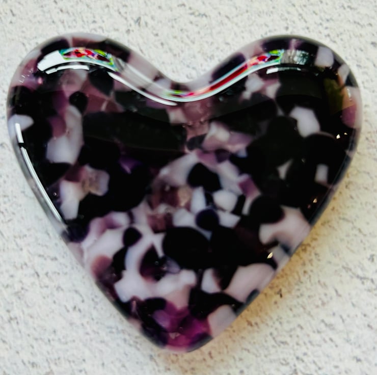 A pretty fused glass cast heart in a mix of layered crushed glass colours including pale opalescent pink, dark purple and violet. Each heart is supplied in a smart branded box making it a perfect gift.