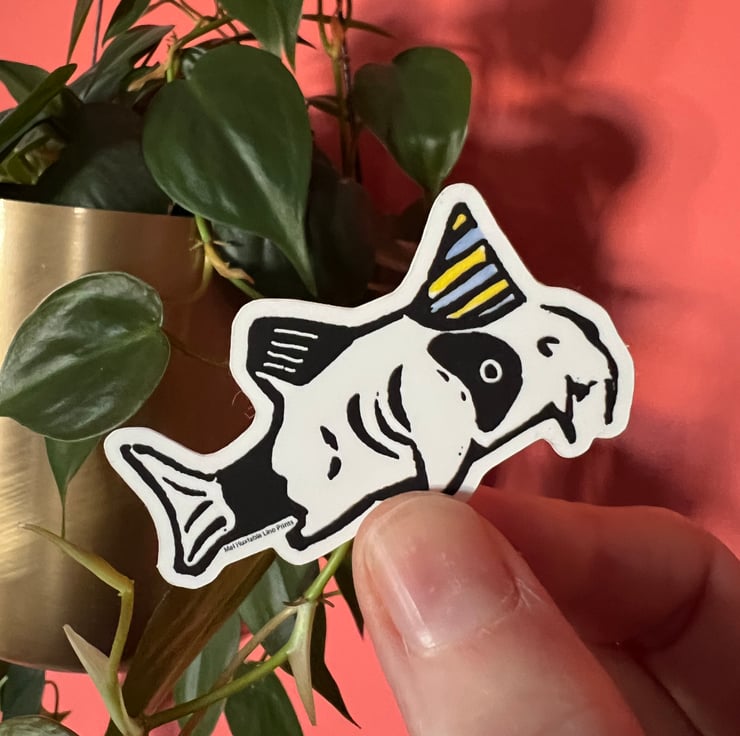 Single vinyl sticker of panda corydora in a party hat.