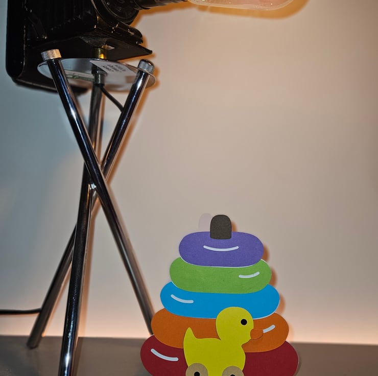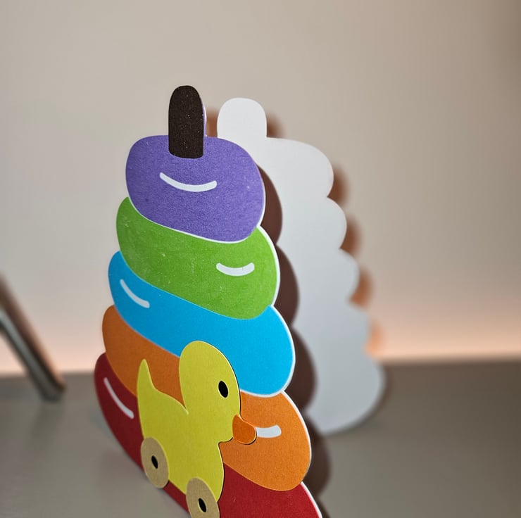 Design: Layered cardstock with a colourful stacking ring and duck motif.