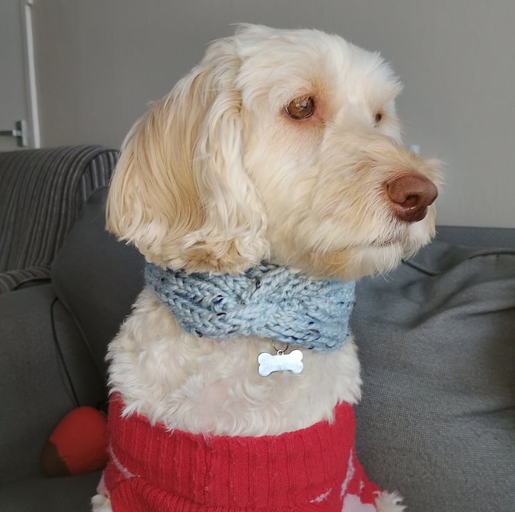 This piece was inspired by cold winter walks and the need for something warm, practical and comfortable for dogs with sensitive ears and necks. I wanted to create a snood that felt soft and cosy but still had a timeless countryside look, using beautiful tweed yarn and a ribbed design for stretch and fit. Like all items in my Jacob’s Threads collection, it is made with care in memory of my beloved Cocker Spaniel, Jacob, who inspired my return to knitting.