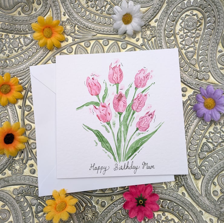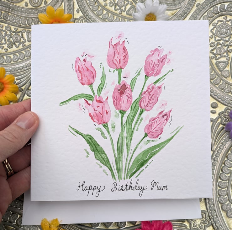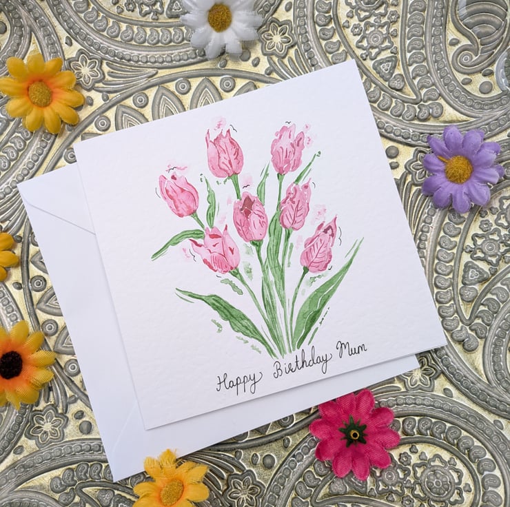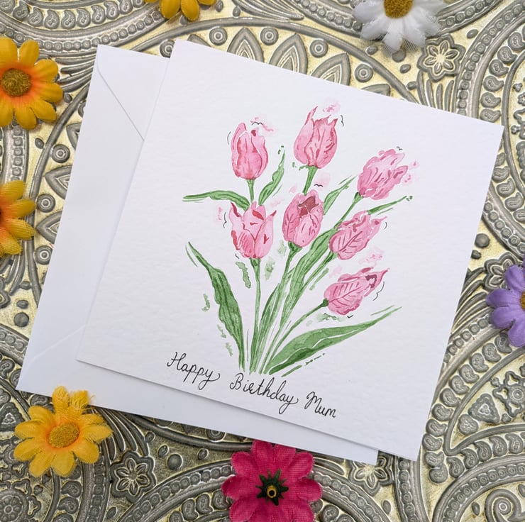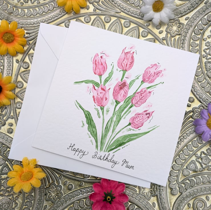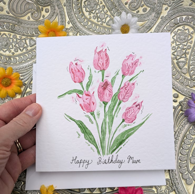 A beautiful hand-painted watercolour Tulips greetings card. A special and unique card, ideal for Mother's day, special birthdays, thinking of you, naming day, christening, anniversaries and more.