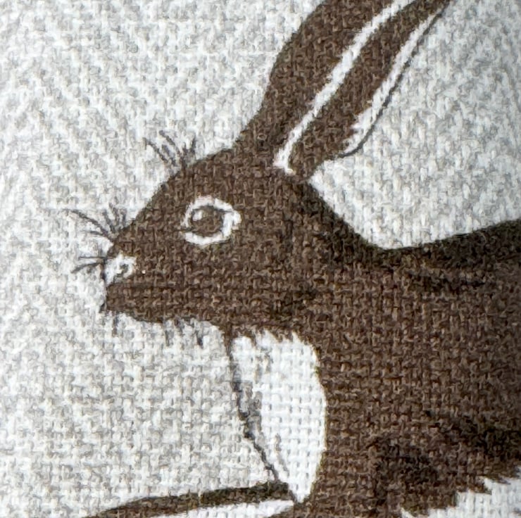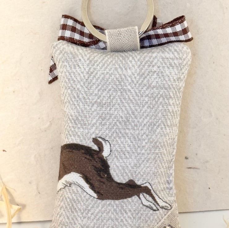 This tactile fabric key ring has a beautiful dark brown hare caught mid-leap, his body wrapping around the whole key ring - head, fore-paws, fabulous long ears on the front, and hind legs and bob-tail on the back. The background is stone-coloured herringbone cotton.