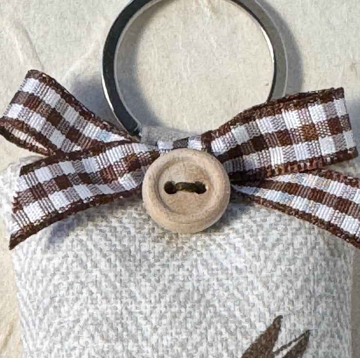 The key ring can be filled with either fragrant lavender or with hypoallergenic wool toy stuffing. The stainless steel split ring is secured with a linen tab - and there is a choice of split ring shapes: circle, heart or star. Finished with a round wooden button and the option of a brown and white gingham ribbon bow.