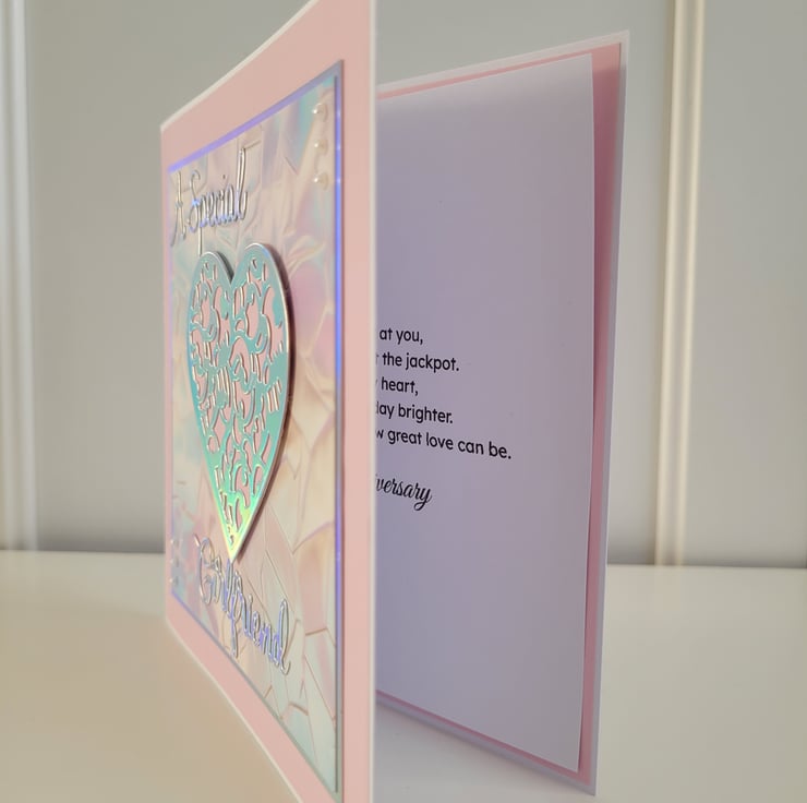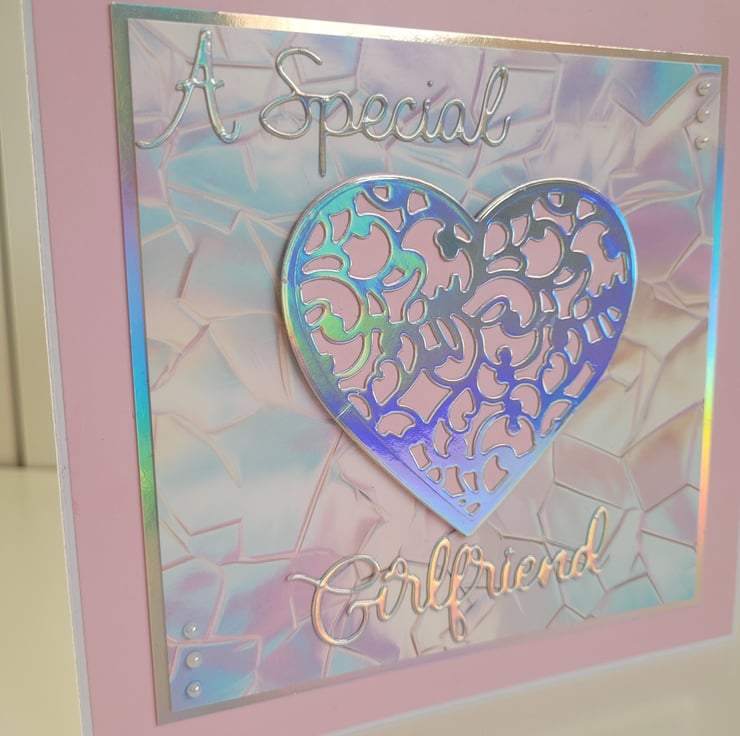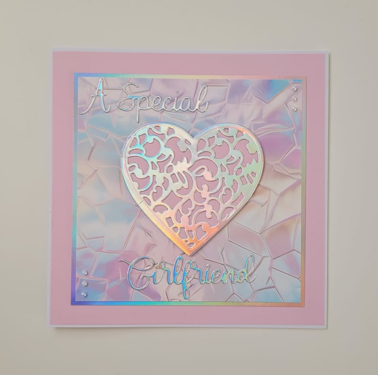 6x6 inch card featuring stunning mirrored card accents, an ornate die cut heart and coordinating patterned card, paper, sentiments and pearls.