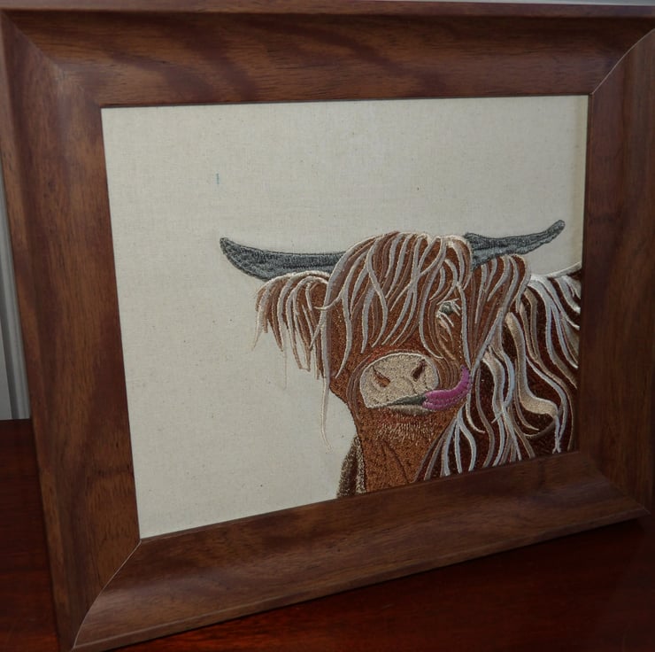 Howard the highland cow embroidered wall art framed in a walnet effect frame which measures apprx 13" x 11" can be either freestanding or wall mounted