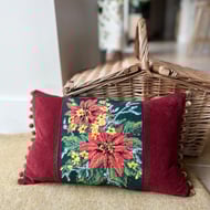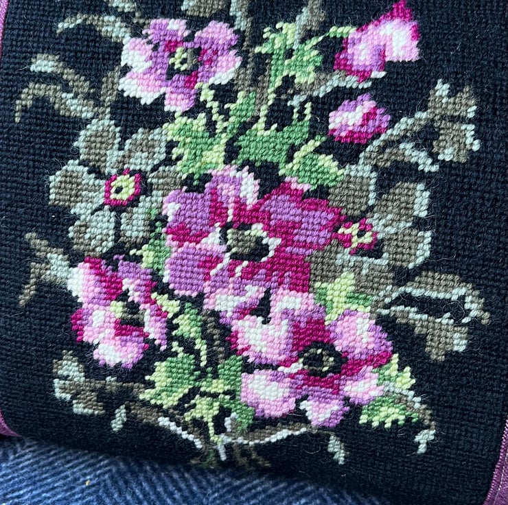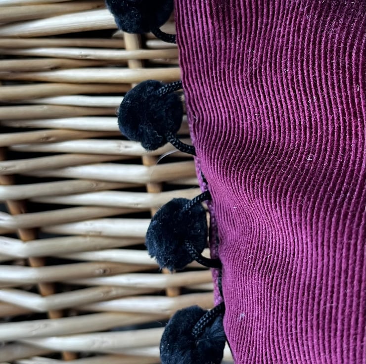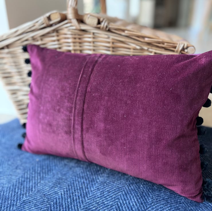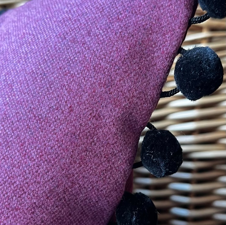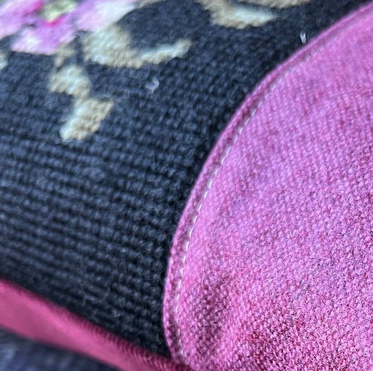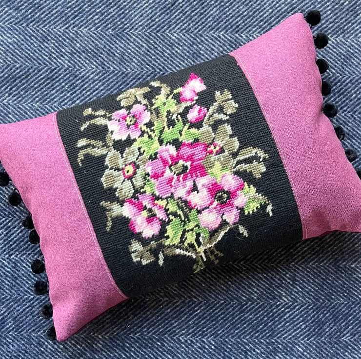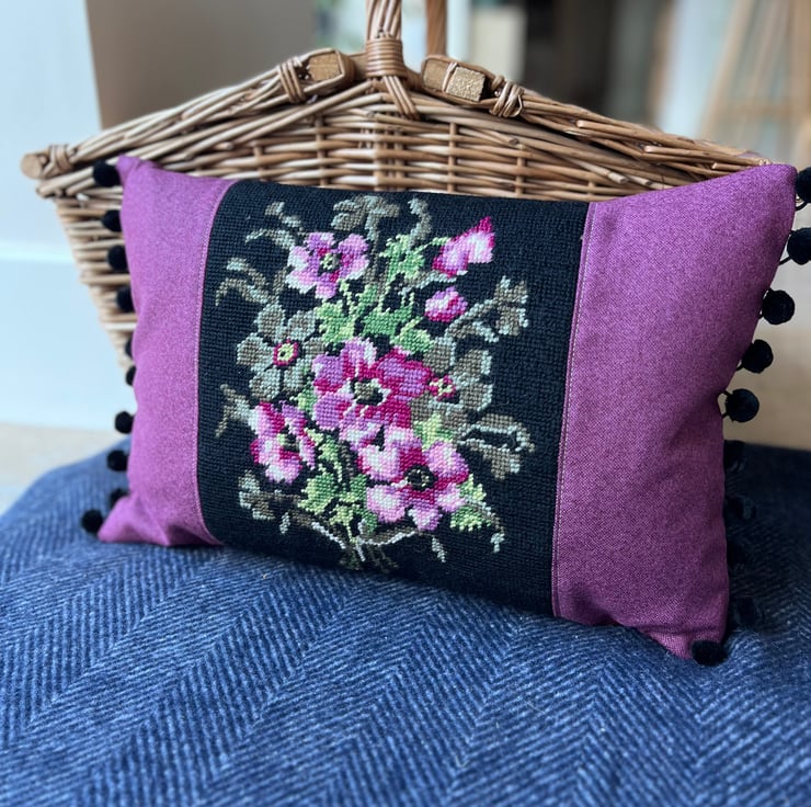 Beautiful one of a kind cushion cover with a pretty panel of vintage tapestry featuring purple anemones on a black background. I’ve added purple wool-polyester blend fabric either side of the tapestry and the back is berry coloured needlecord taken from a sample swatch. The ends are trimmed with velvety black pompoms.