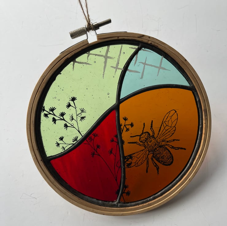 A beautiful stained glass filled embroidery hoop made using the Tiffany ( copper foiled ) method of stained glass . There are 4 pieces of glass in muted tones of green, blue, red and orange. It has a screen printed bee, foliage and abstract marking in black enamel which has been fired in the kiln . The glass has been soldered into an embroidery hoop and it hangs with a hessian string .-