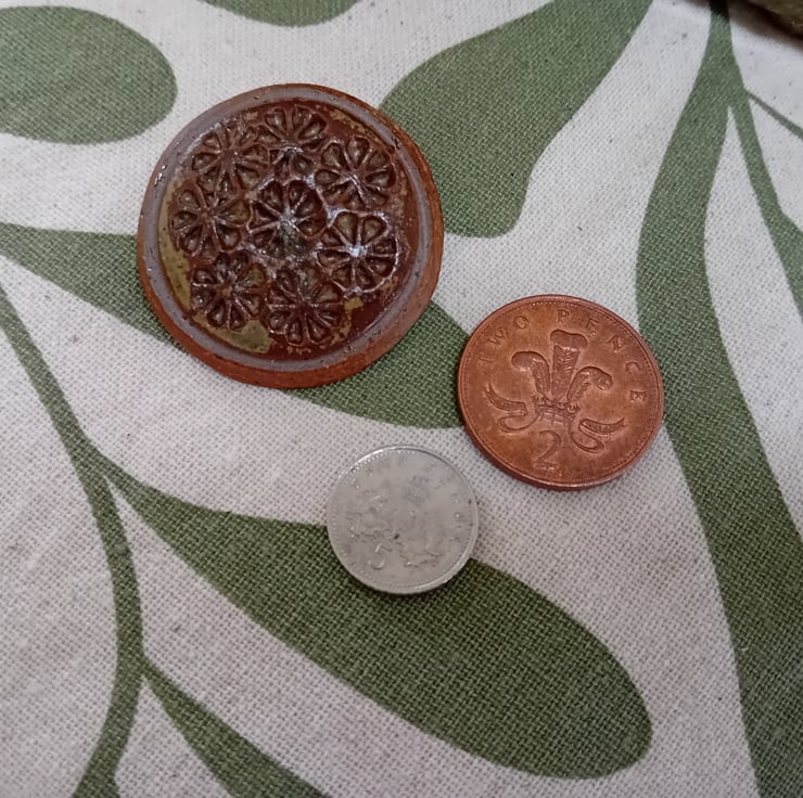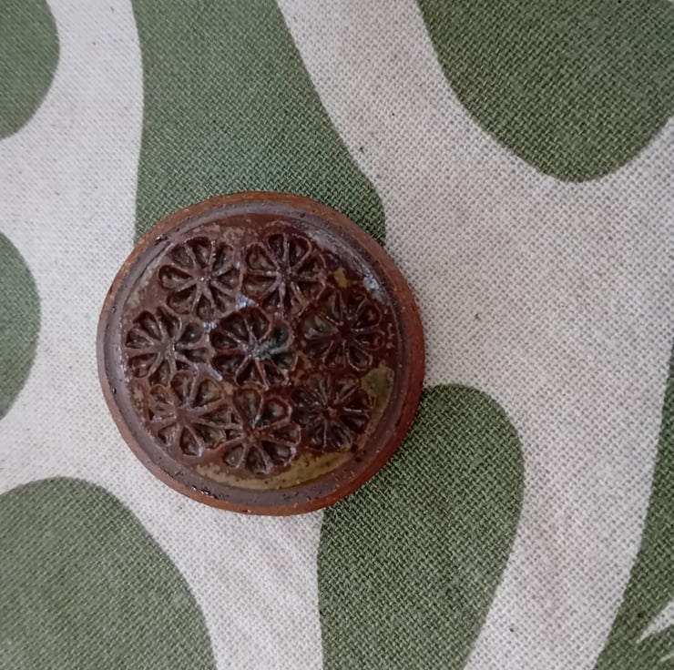 A ceramic embossed stoneware brooch with a celadon glaze.
