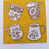 All my Lino Prints are printed by me using inks and rollers and getting messy. The designs are from my own original drawings or artwork which I transfer to the Lino then carve away for days sometimes weeks. Before finally inking and printing using a press. This process is repeated several times to produce a multi coloured print.