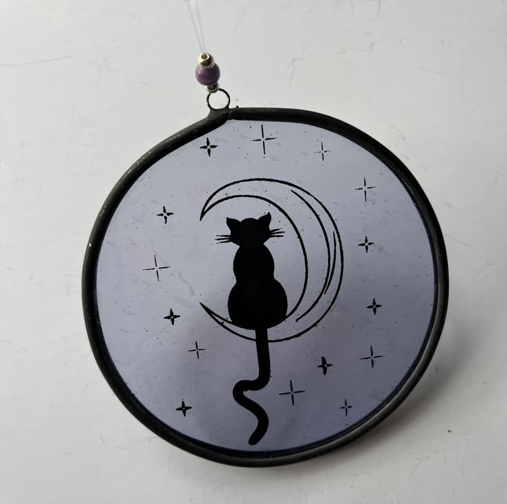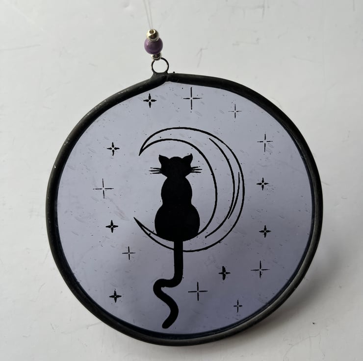 A beautiful stained glass roundel. A pale purple glass has been screen printed with an image of a cat sitting on the moon in black enamel.The lead came edge has been patinated to give a black antique finish, and it has a clear nylon hanging thread with beads.