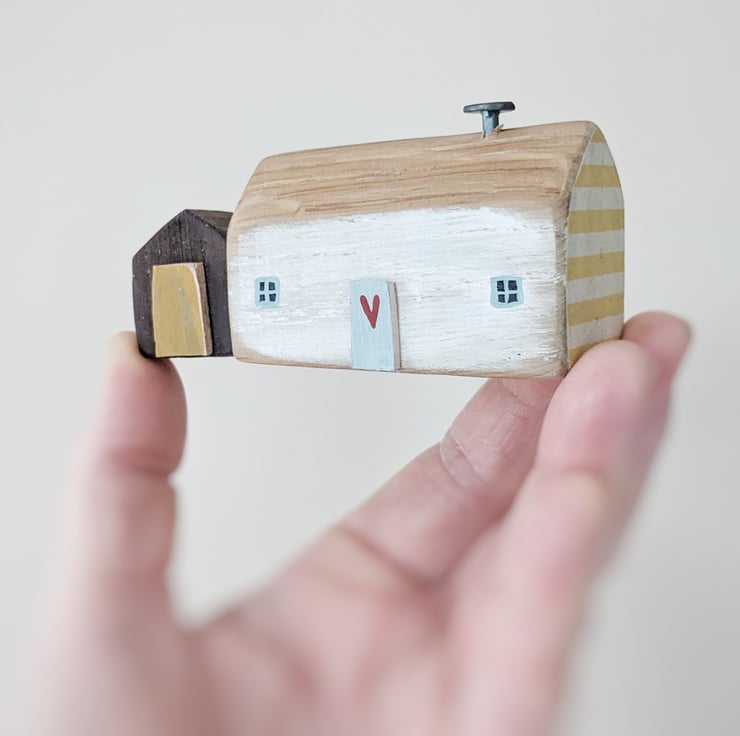 This little wooden house has been hand carved and painted and each piece is one of a kind.