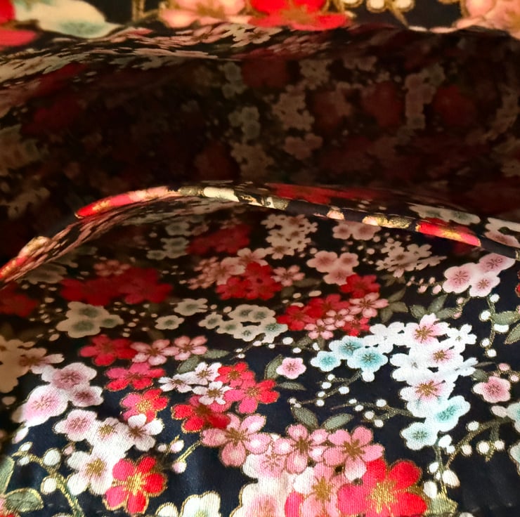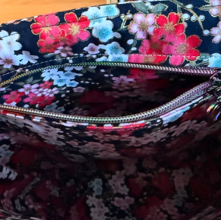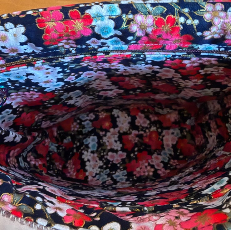 Inside I've lined the bag with a Japanese flower patterned thick hardwearing cotton. The strap is fully adjustable and the hardware is iridescent.