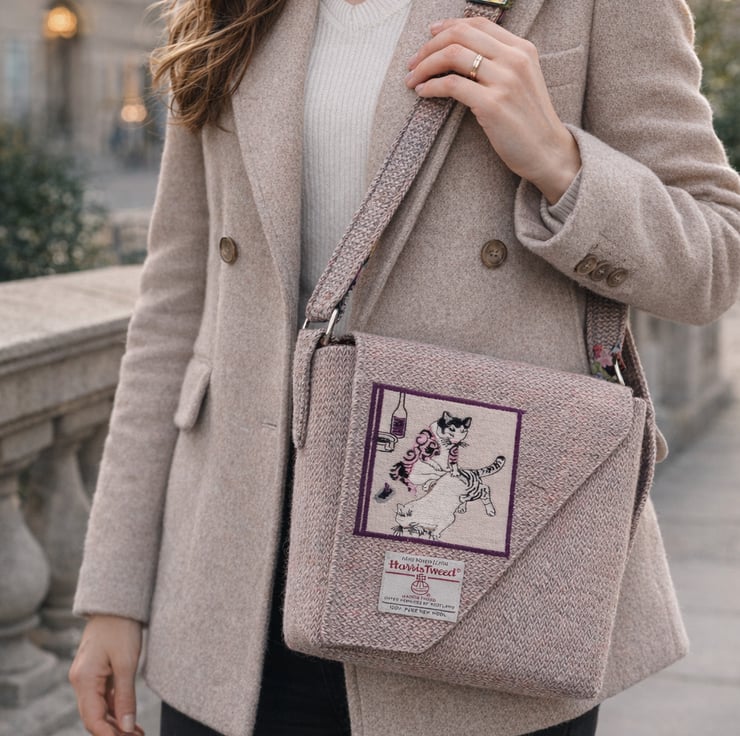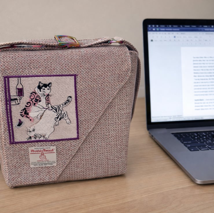 This stunning Harris Tweed has been embroidered on the flap with a panel depicting a tattooing cat...