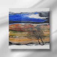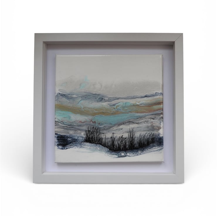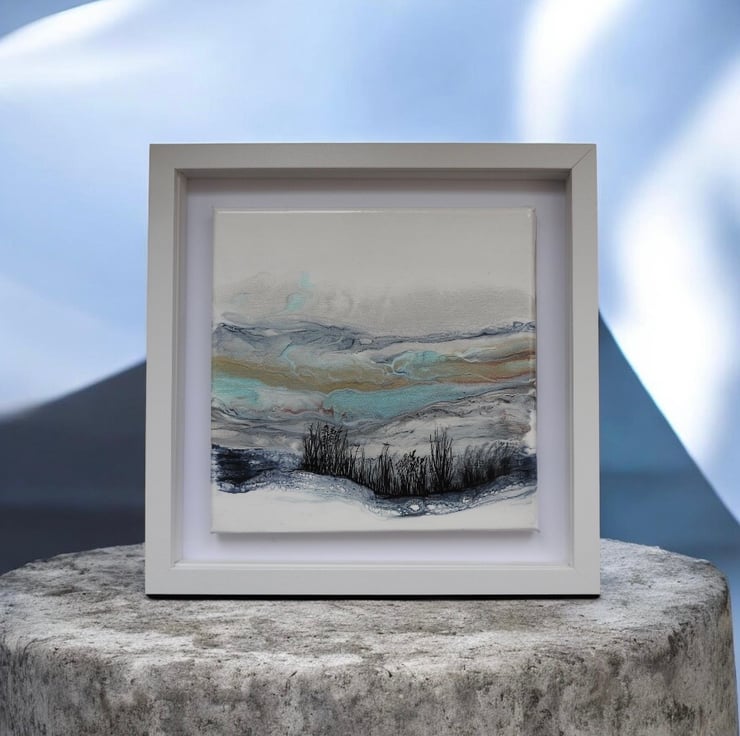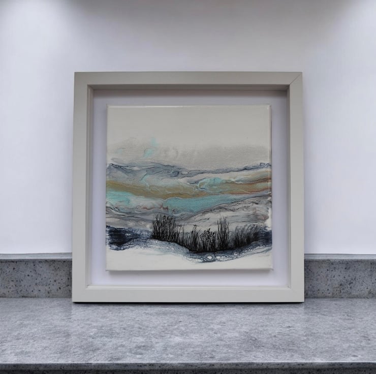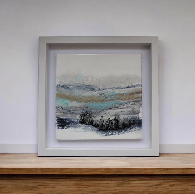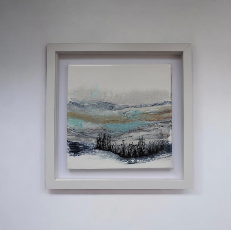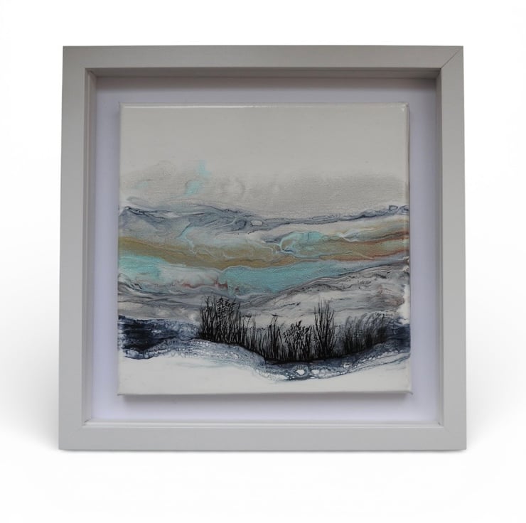 Depicting Northumberland hills original painting in shimmering frosty whites , blues and turquoise. Finished with a gloss varnish ready to hang .