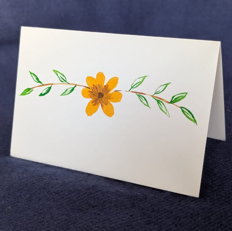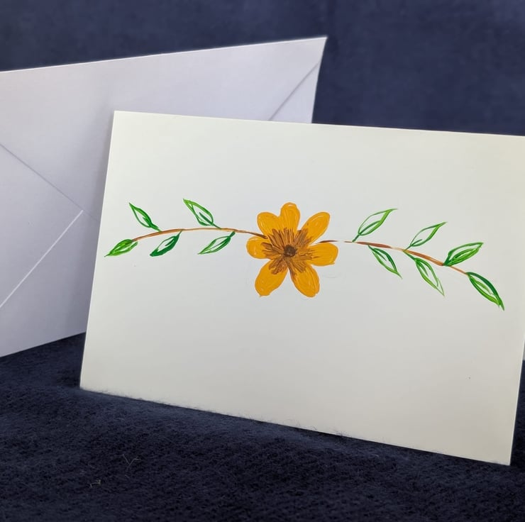 Beautiful hand-painted greeting card featuring a delicate yellow flower with green leafy branches in a modern minimalist style.