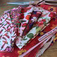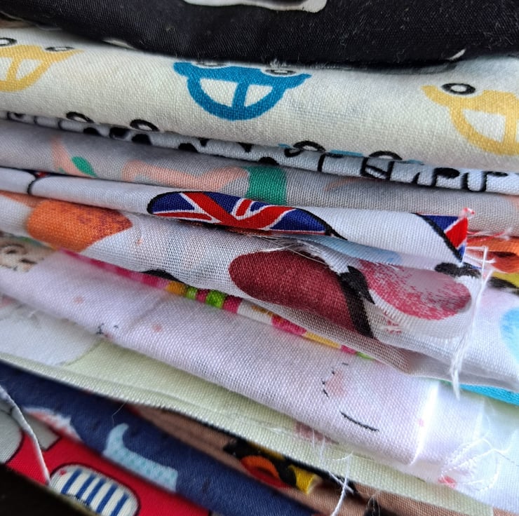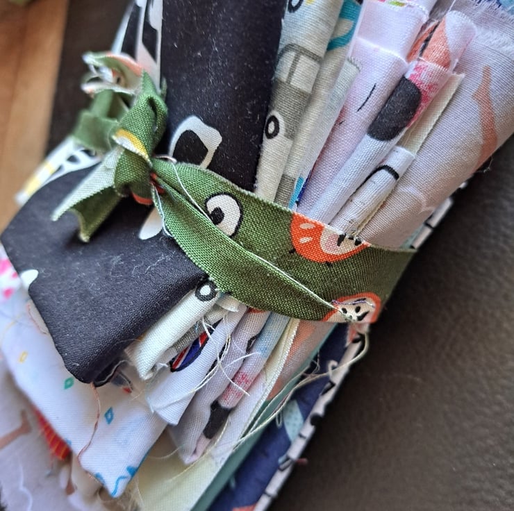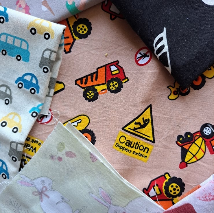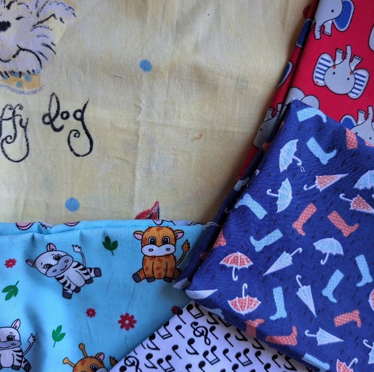 A delightfully playful bundle of 17 pieces of cotton (two polycotton, I think), featuring childhood designs of animals, cars, sweets, balloons, musical notes, you name it. Some are large, some not so much. Just lighten up.