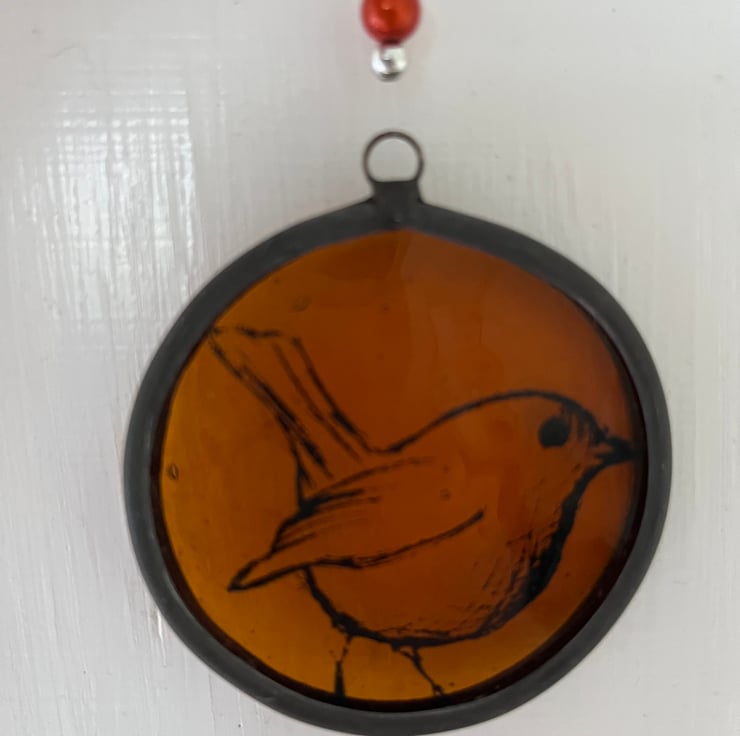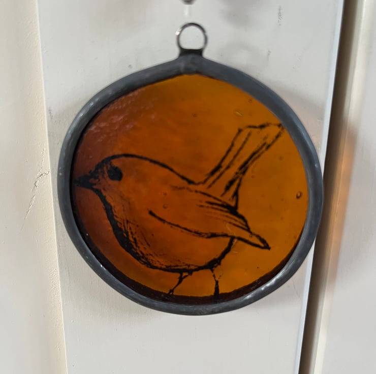 A beautiful stained glass roundel. An amber glass has been screen printed with an image of a little bird in black enamel.The lead came edge has been patinated to give a black antique finish, and it has a clear nylon hanging thread with beads.