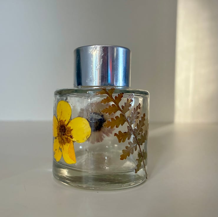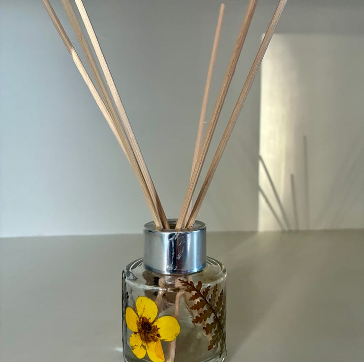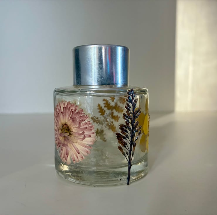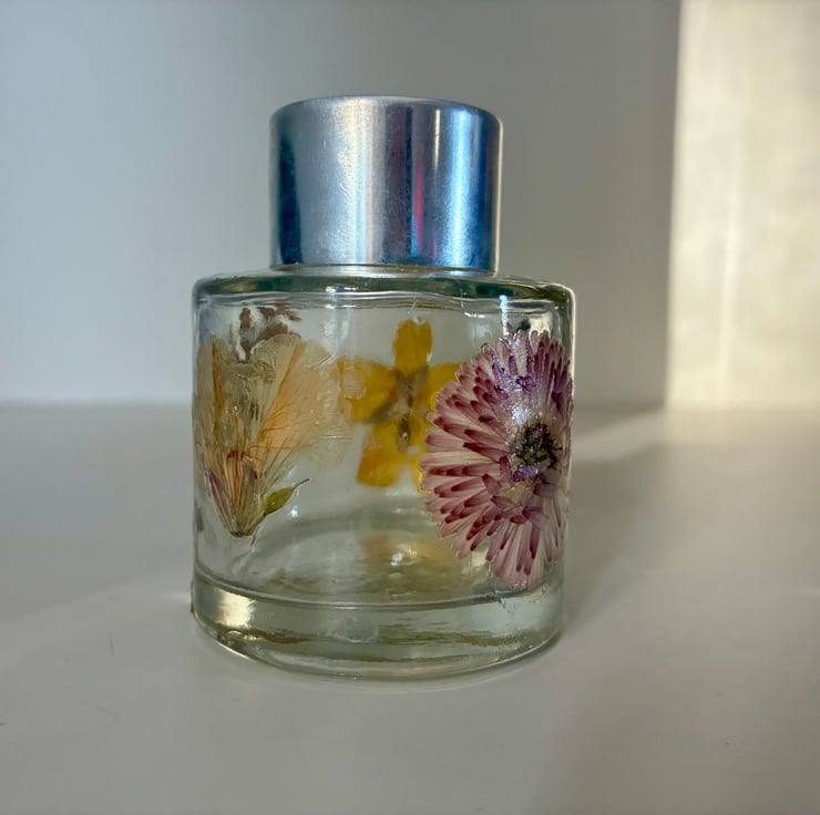 Small reed diffuser (holds 50 mls). Handmade using pressed flowers from our garden.