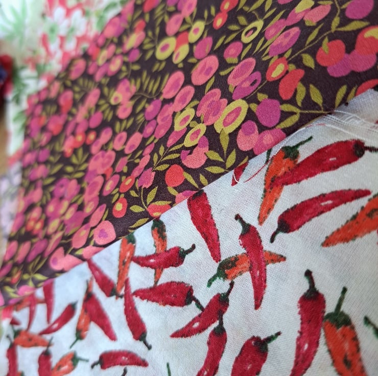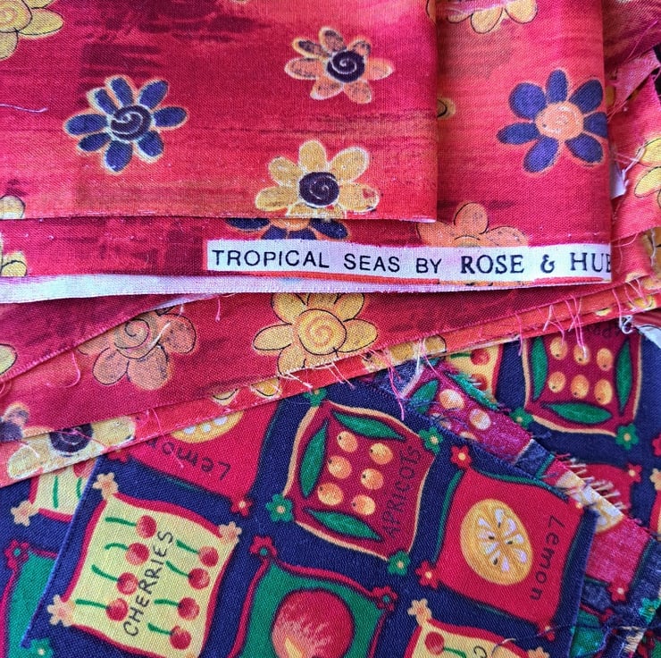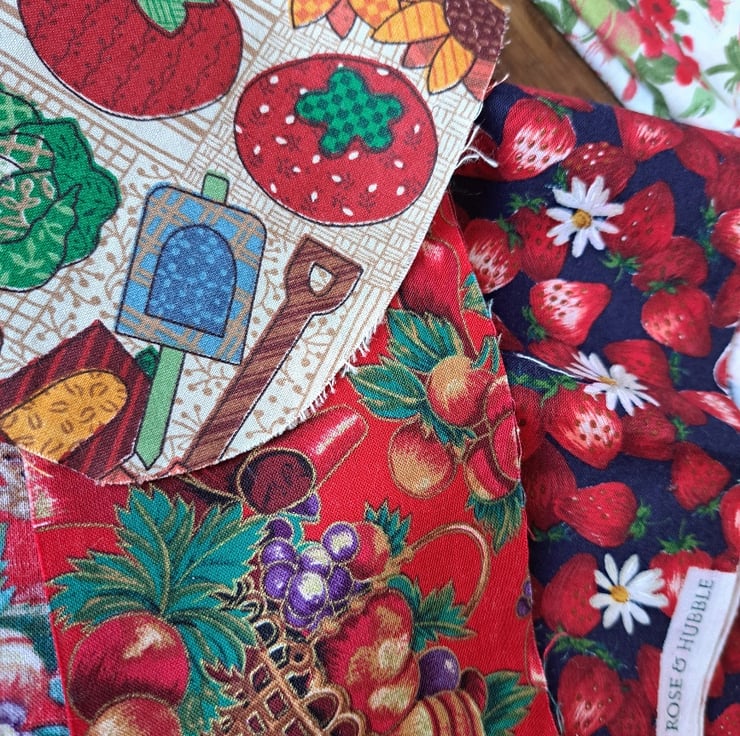 Here's a lovely thing... a proper scrap bundle, full of vintage offcuts and little surprises, gathered together under a flowery and fruity theme. There are several vintage Rose & Hubble strips, some chilli pepper scraps, some vibrant pieces dating from the 80s or early 90s and even a smallish piece of Liberty Tana lawn. For the real scrap lovers.