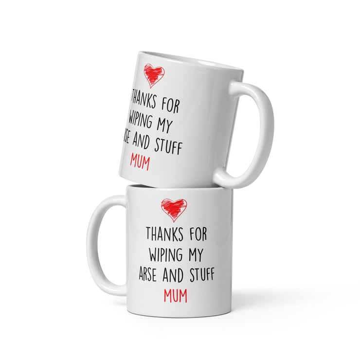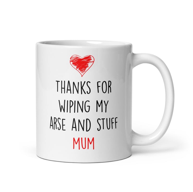 Say thank you to Mum in the most honest way possible with this cheeky “Thanks For Wiping My Arse and Stuff Mum” mug. Featuring a simple modern font and red heart detail, this funny yet affectionate design is perfect for mums who appreciate humour with a bit of edge.
