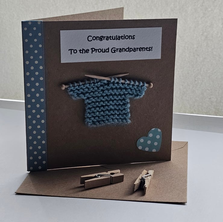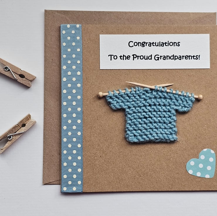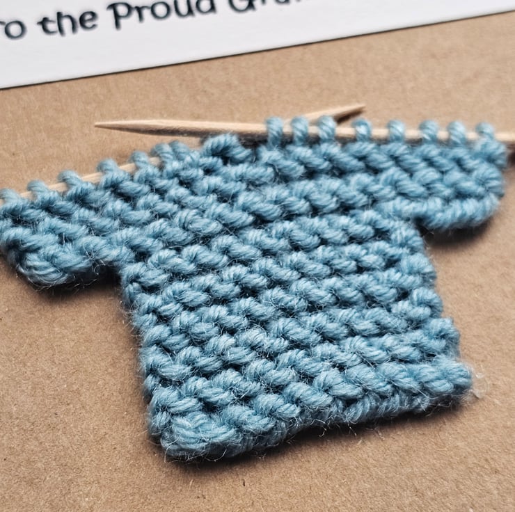 The knitted jumper is knitted by me with quality duck egg blue yarn and then transferred onto my handmade tiny knitting needles. The text on inkjet watercolour paper. The card is finished with a matching length of spotty duck egg blue ribbon and a paper heart shape. You can also purchase small knitted jumpers gift tags in a variety of colours in my shop.