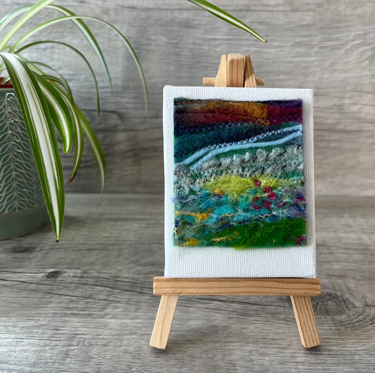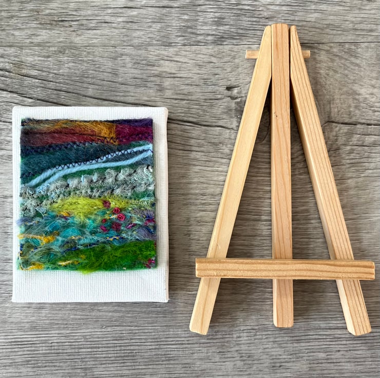 The textile art landscape is mounted on a small wooden easel. The easel measures 14cm x 8cm and the canvas the the embroidery is mounted on, 9cm x 7cm