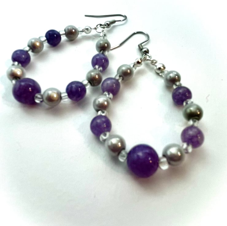 A beaded hoop pair of earrings made using Lavender Quartz gemstone beads and silvery miracle beads.