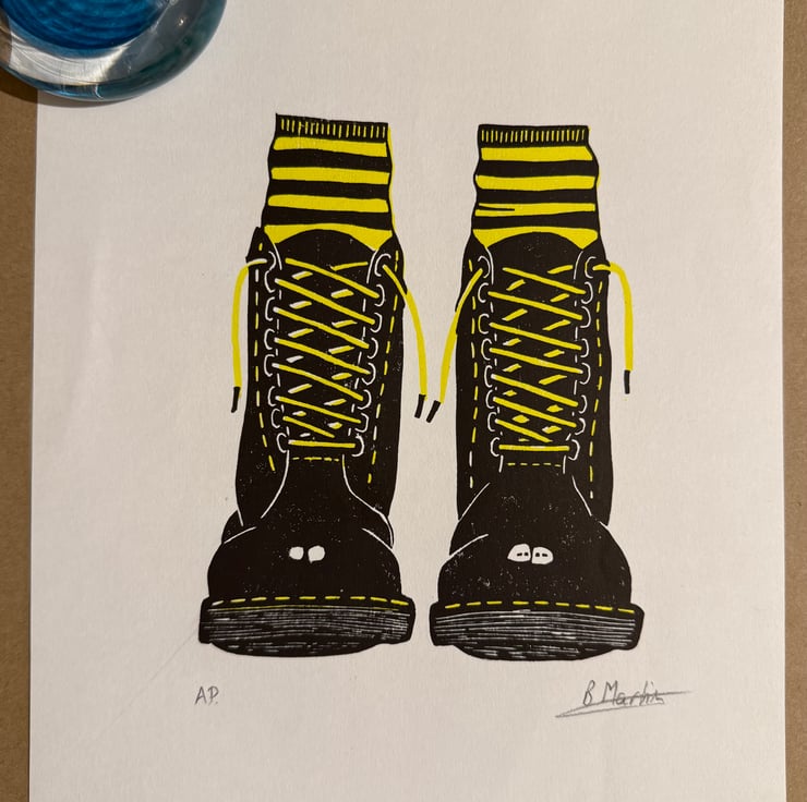 A hand burnished multi block print of a lino cut taken from my original sketch of docs and socks.