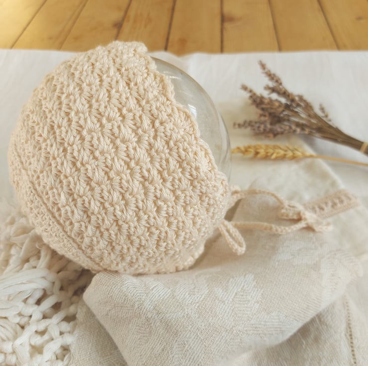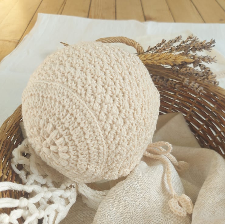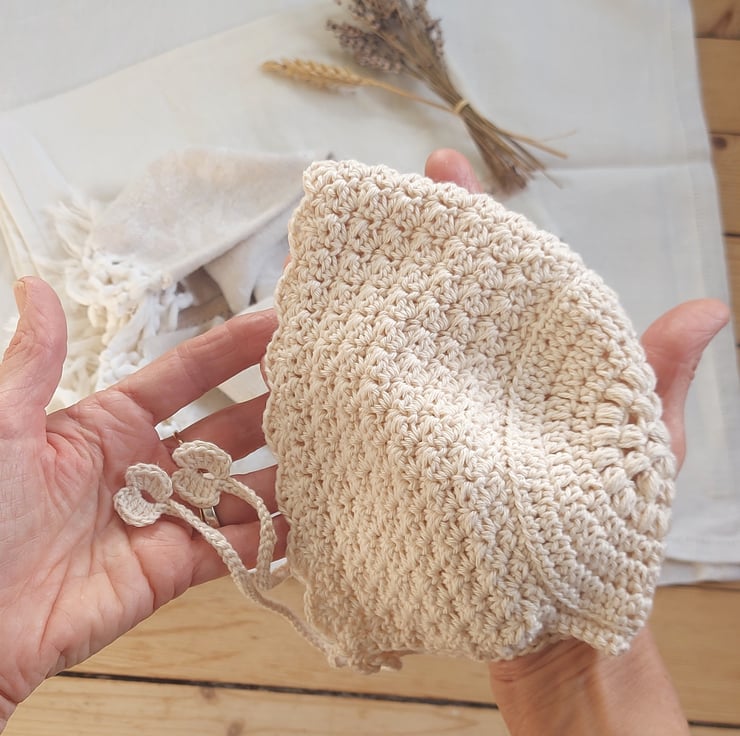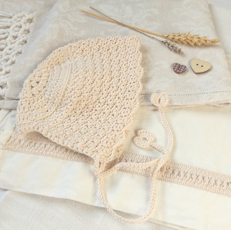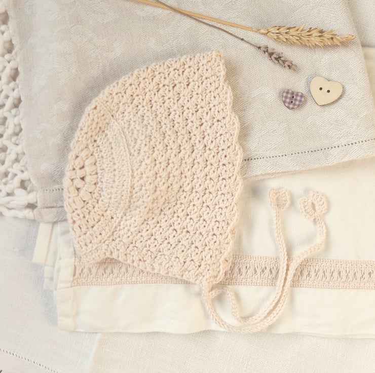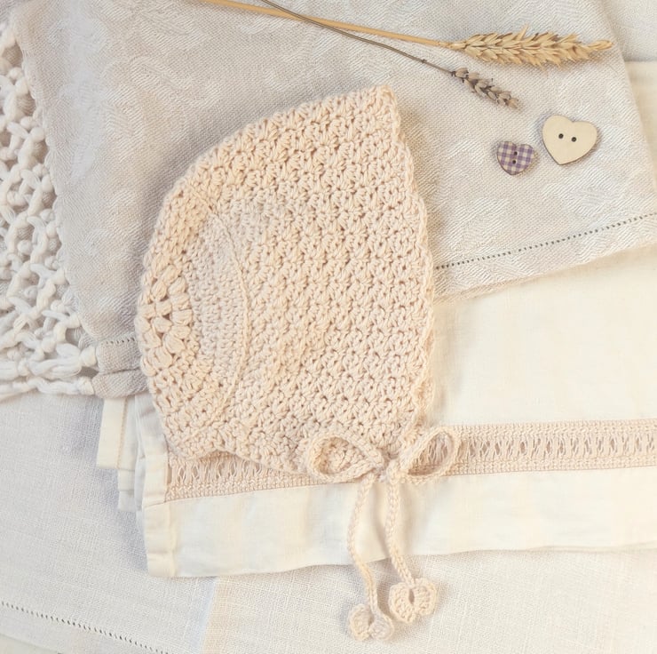 I beautifully handmade this little bonnet with a lovely decorative pattern that gives it texture and elasticity and protects the baby’s head from both cold and sun.