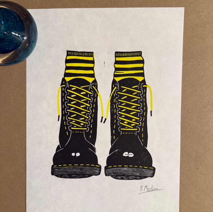 A hand burnished multi block print of a lino cut taken from my original sketch of docs and socks.