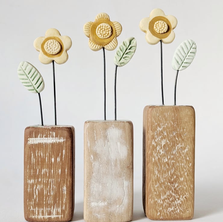 A little clay flower stands on a wire stalk in a sanded and painted wooden block.