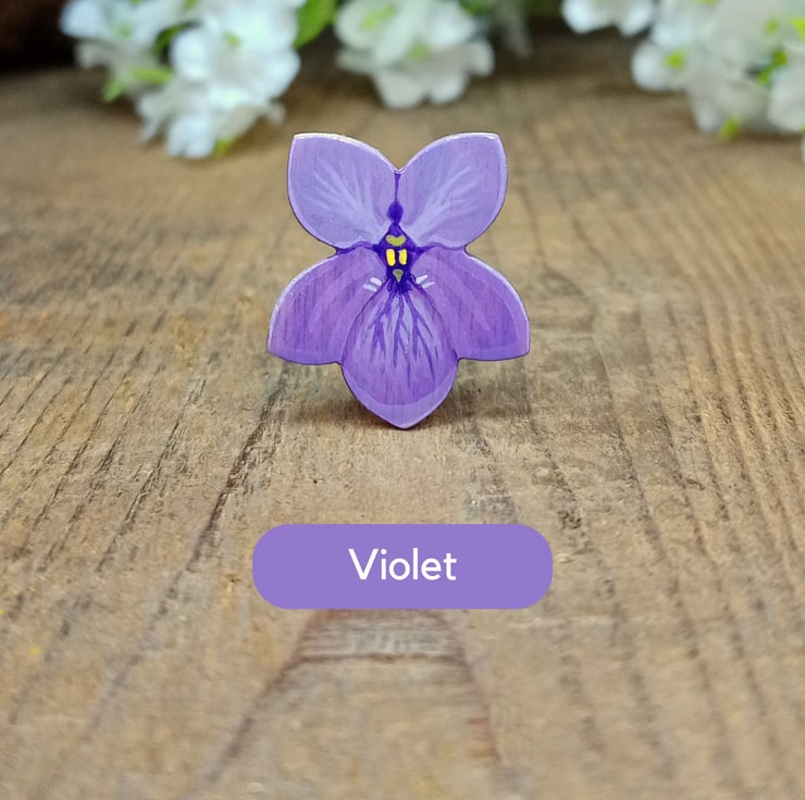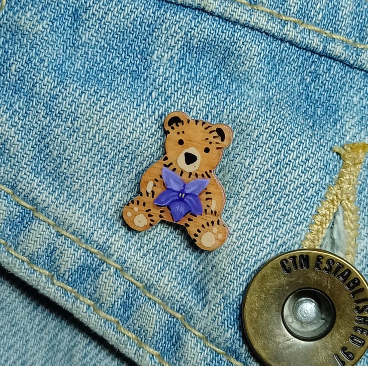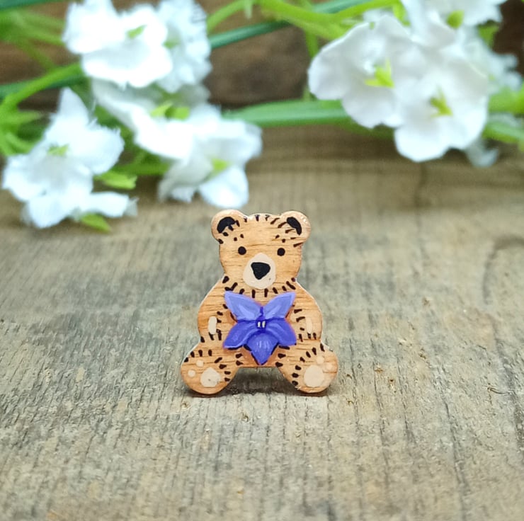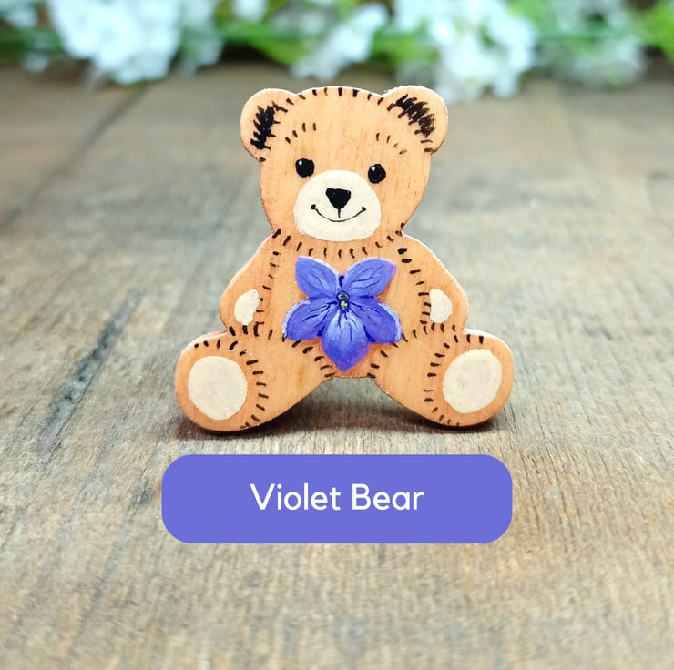 This handmade tiny violet bear brooch is hand painted and completely one of a kind. Featuring delicate violet flowers, the February birth flower, it makes a thoughtful birthday gift or a meaningful keepsake for someone special.