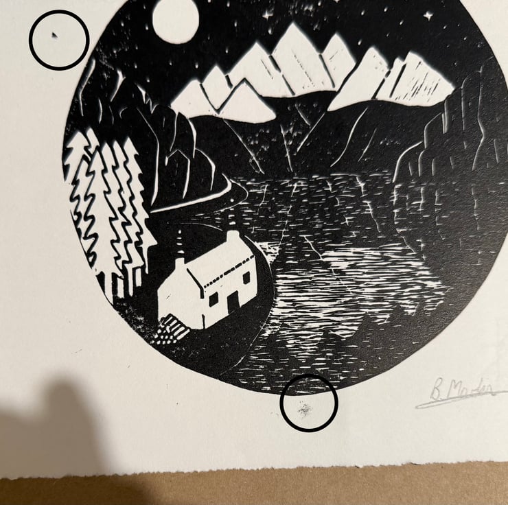 The first two pictures show the print that you will receive with any imperfections highlighted. In this case the ink has caught the outside of the picture.