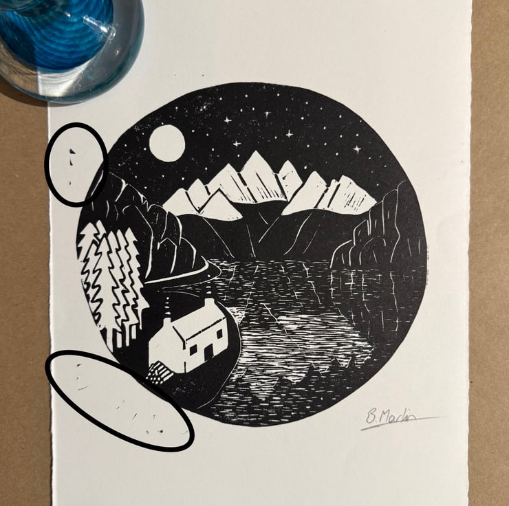 The first two pictures show the print that you will receive with any imperfections highlighted. In this case the ink has caught the outside of the picture.