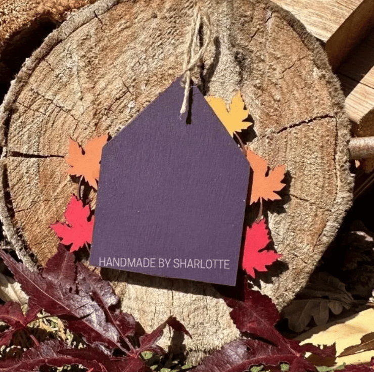 Hand painted and assembled, on elements designed solely by myself, Wooden Scandinavian Cottage House Inspired Autumn hanging ornament with five Maple Leaves.