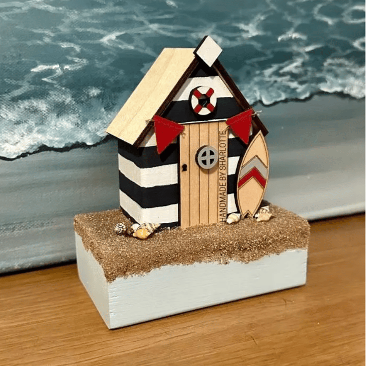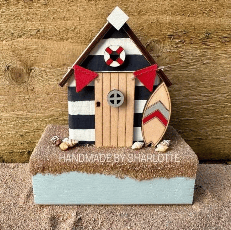 Limited Edition Hand cut, sanded, painted and assembled, on elements designed solely by myself, wooden single miniature Beach Hut Ornament.