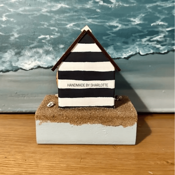 This beach hut, a miniature version of the HBS classic, is a perfect gift for a beach or nautical lover, comes complete with a roofed beach hut in Ink Blue stripes with Deep Red Accent Colour and a Scandi Blue base! It's limited edition as it comes with a topping of sand and seashells.
