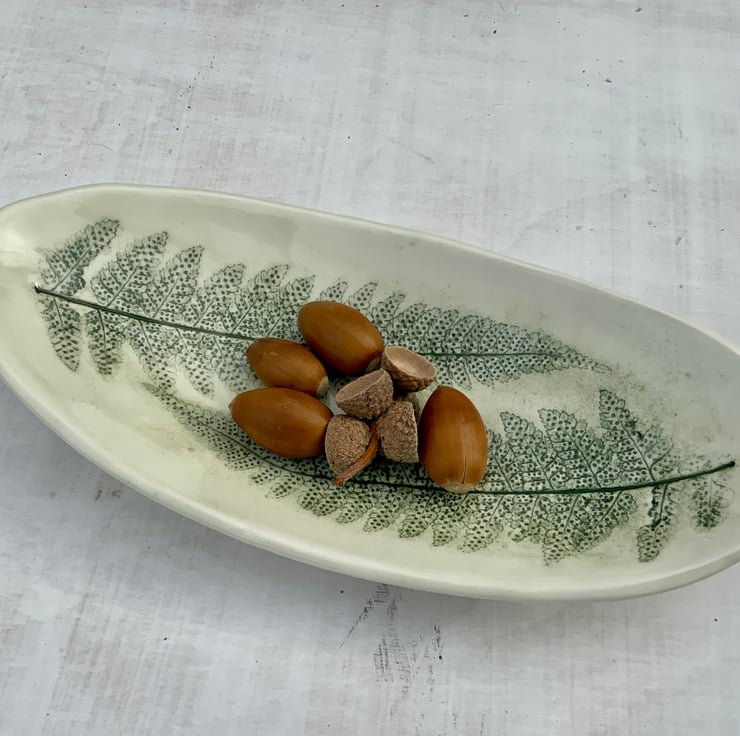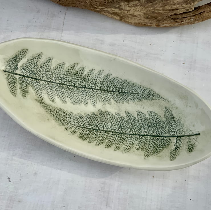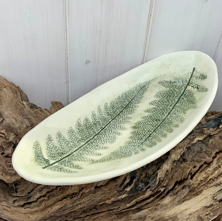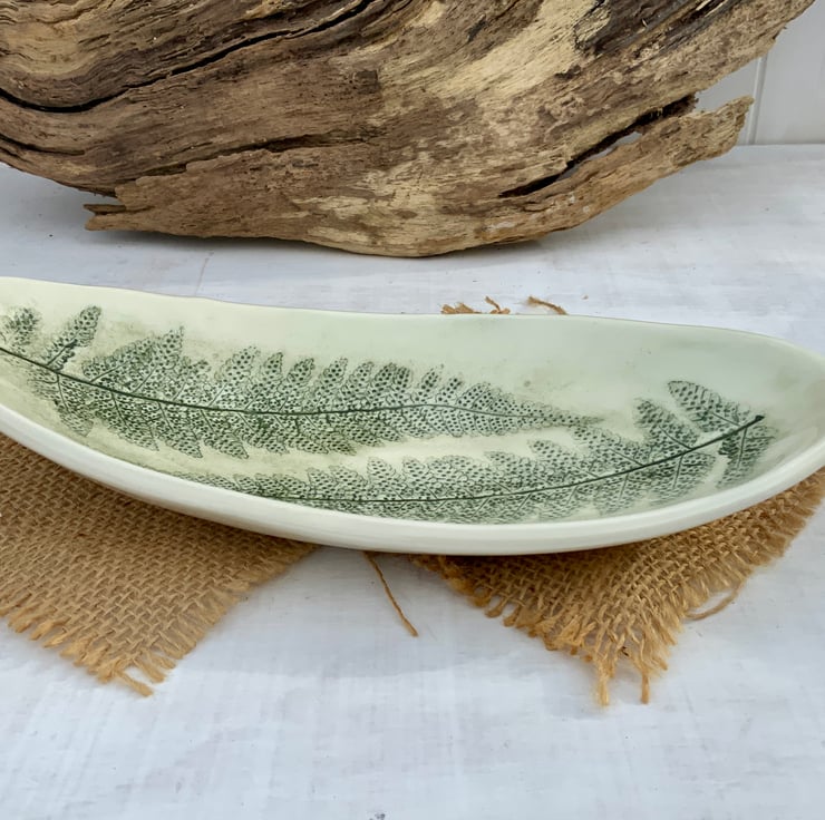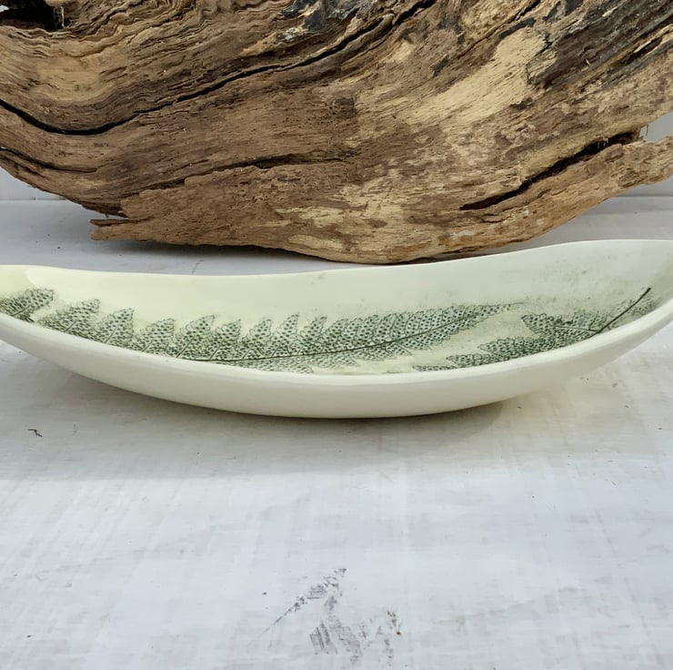 This hand built oval curved dish has been imprinted with fern leaves, recording a real touch of nature in the surface of the white stonewear clay. Carefully glazed to highlight the impressions, then sealed with a clear glaze. Each piece is unique, bringing the beauty of handcrafted pottery into your home.
