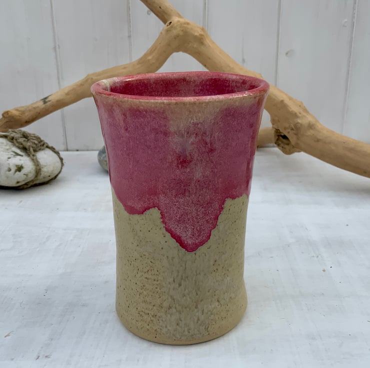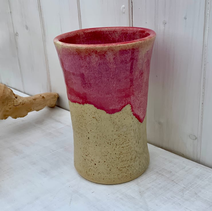 This stoneware handleless mug (beaker) is lovingly wheel-thrown for a comfortable, balanced feel in your hands. Finished in beautiful Winter Wood and Raspberry Mist glazes. Each piece is unique, making every mug one of a kind. Perfect for your morning coffee, afternoon tea, or a warming hot chocolate, this handcrafted handleless mug brings a little artistry to everyday rituals.