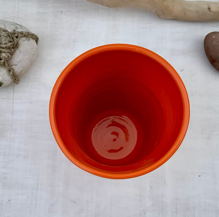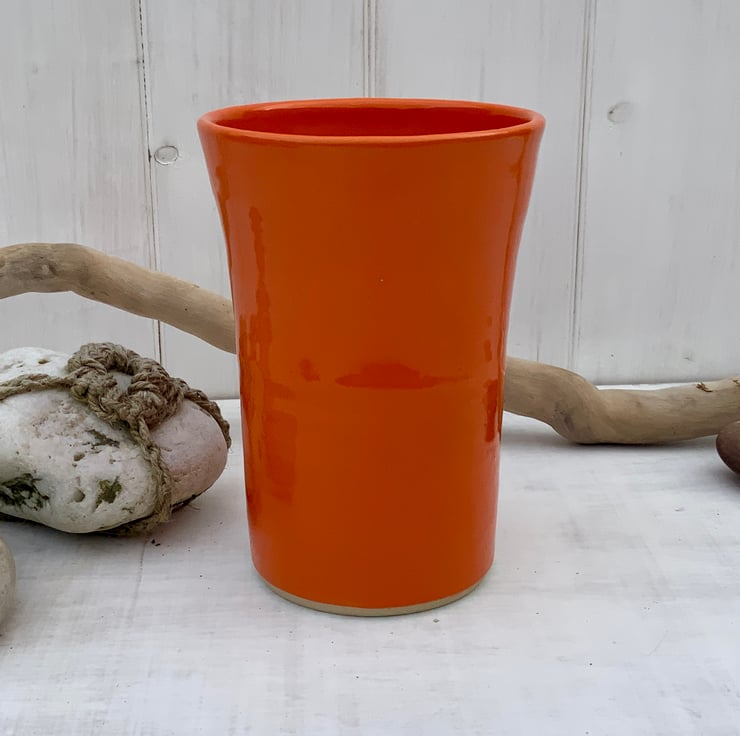 This stoneware handleless mug (beaker) is lovingly wheel-thrown for a comfortable, balanced feel in your hands. Finished in a bright Orange Gloss glaze, this will certainly standout in the crowd . Each piece is unique, making every mug one of a kind. Perfect for your morning coffee, afternoon tea, or a warming hot chocolate, this handcrafted handleless mug brings a little artistry to everyday rituals.