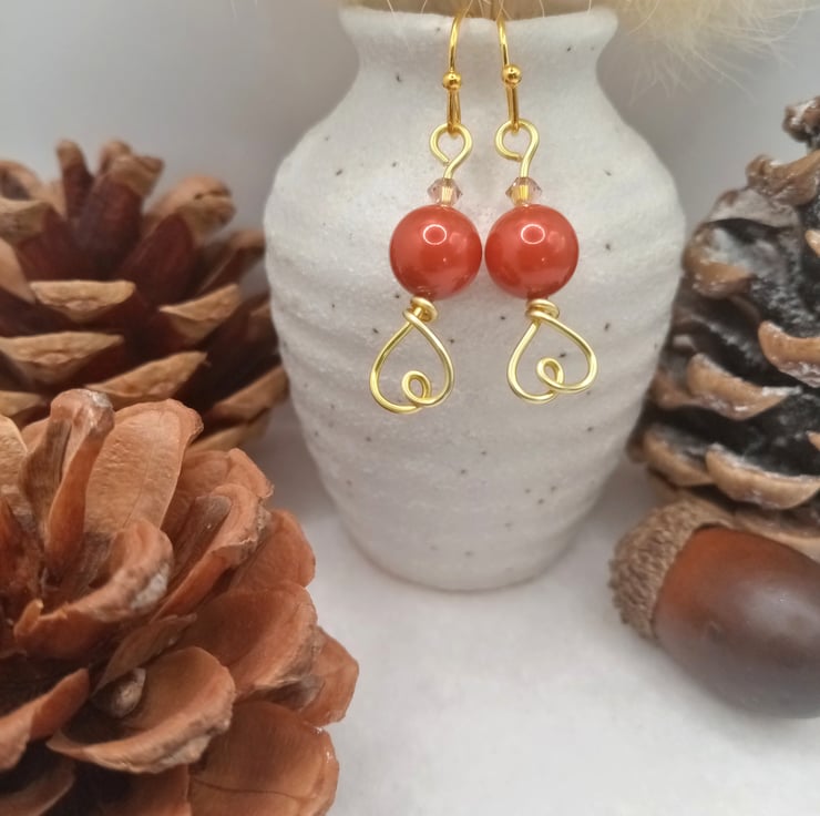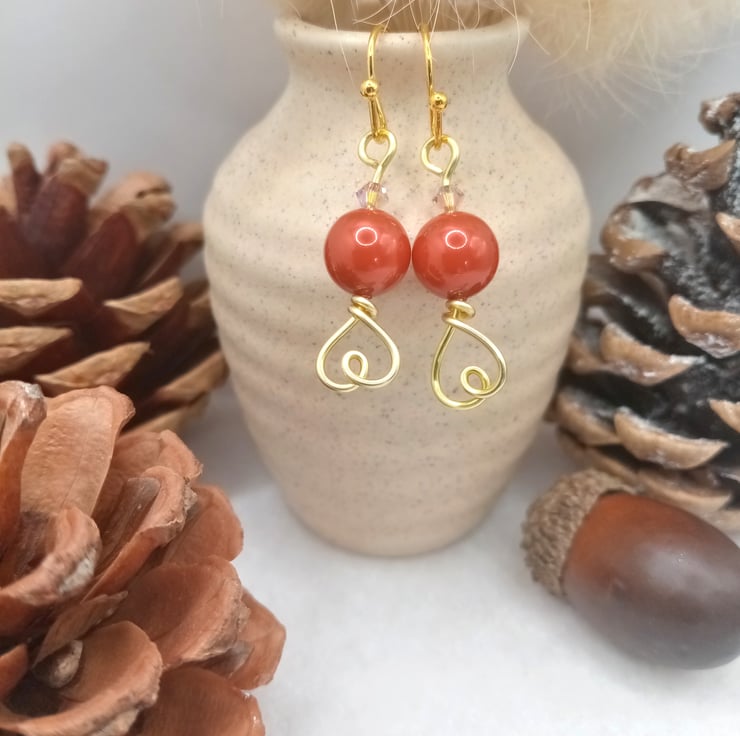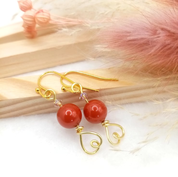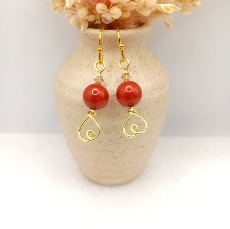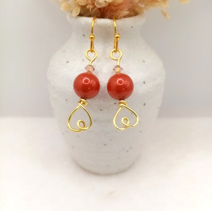 Serinity crystal pearl drop earrings in dark coral with gold plated nickle-free earring hooks and a cute love heart design on the base.