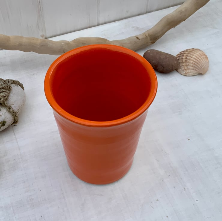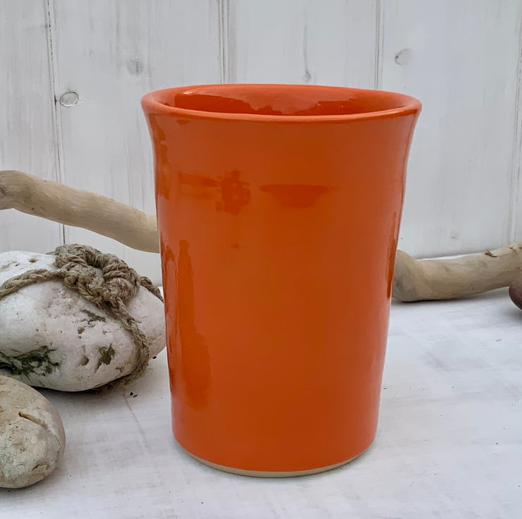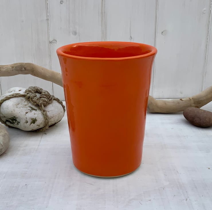 This stoneware handleless mug (beaker) is lovingly wheel-thrown for a comfortable, balanced feel in your hands. Finished in a bright Orange Gloss glaze, this will certainly standout in the crowd . Each piece is unique, making every mug one of a kind. Perfect for your morning coffee, afternoon tea, or a warming hot chocolate, this handcrafted handleless mug brings a little artistry to everyday rituals.